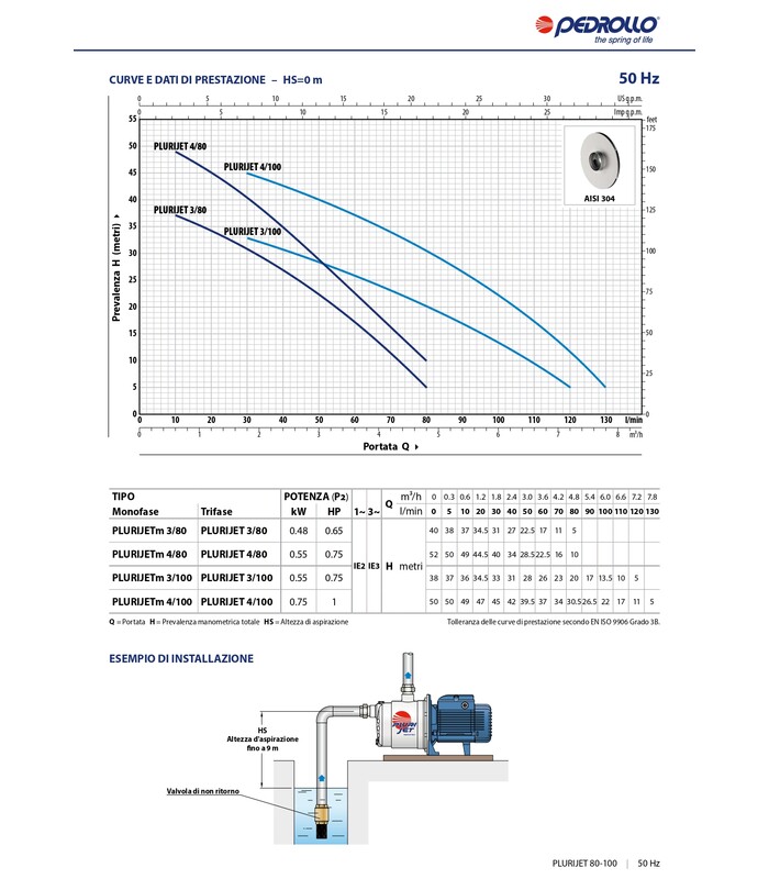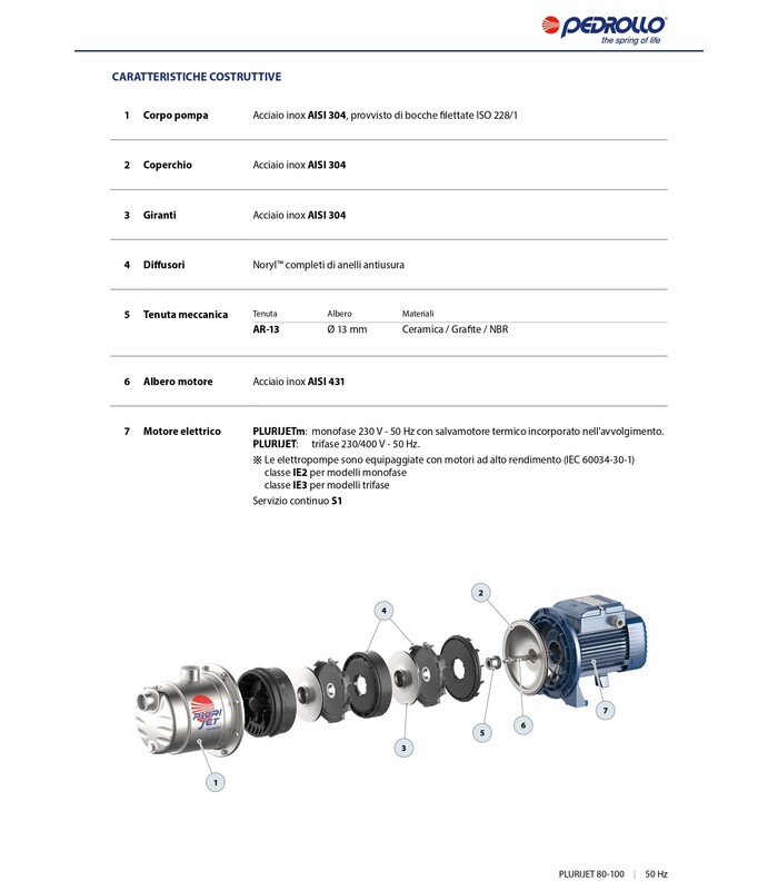 Le elettropompe trifase sono equipaggiate con motori ad alto rendimento (IEC 60034-30-1). Classe di efficienza IE3 per motori trifase, IE2 per i motori monofase, isolamento in classe F e protezione IPX4.