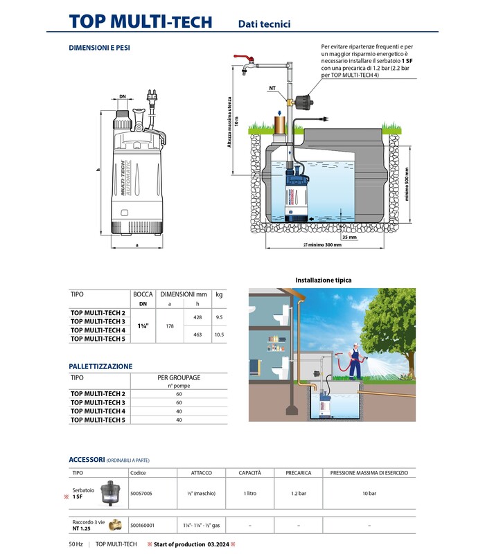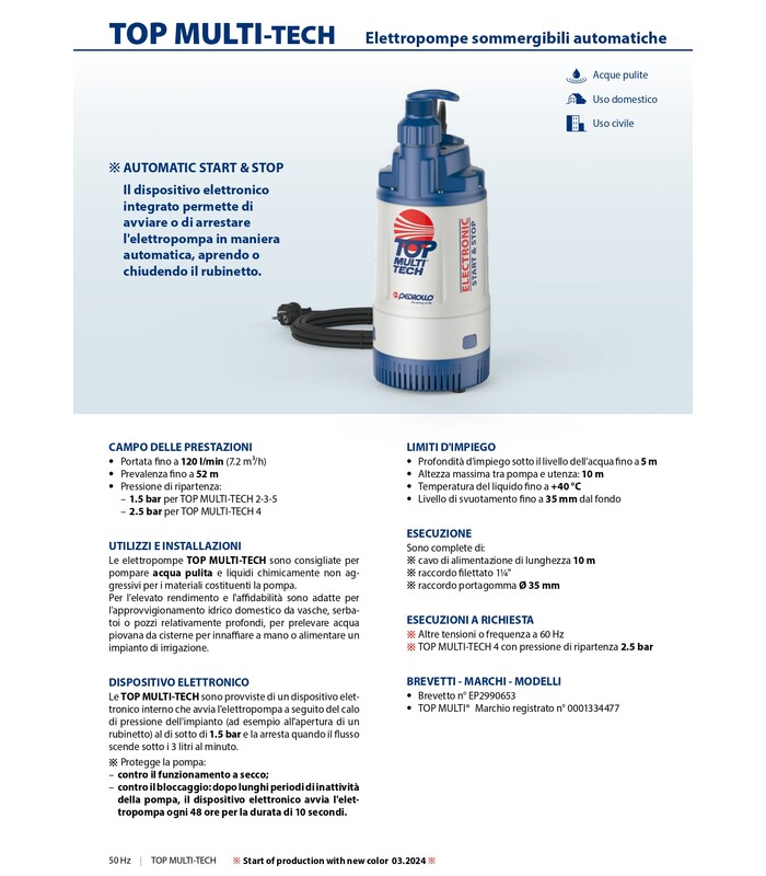 Le elettropompe TOP MULTI-TECH sono consigliate per pompare acqua pulita e liquidi chimicamente non aggressivi per i materiali costituenti la pompa. Per l'elevato rendimento e l'affidabilità sono adatte per l'approvvigionamento idrico domestico da vasche, serbatoi o pozzi relativamente profondi, per prelevare acqua piovana da cisterne per innaffiare a mano o alimentare un impianto di irrigazione.
