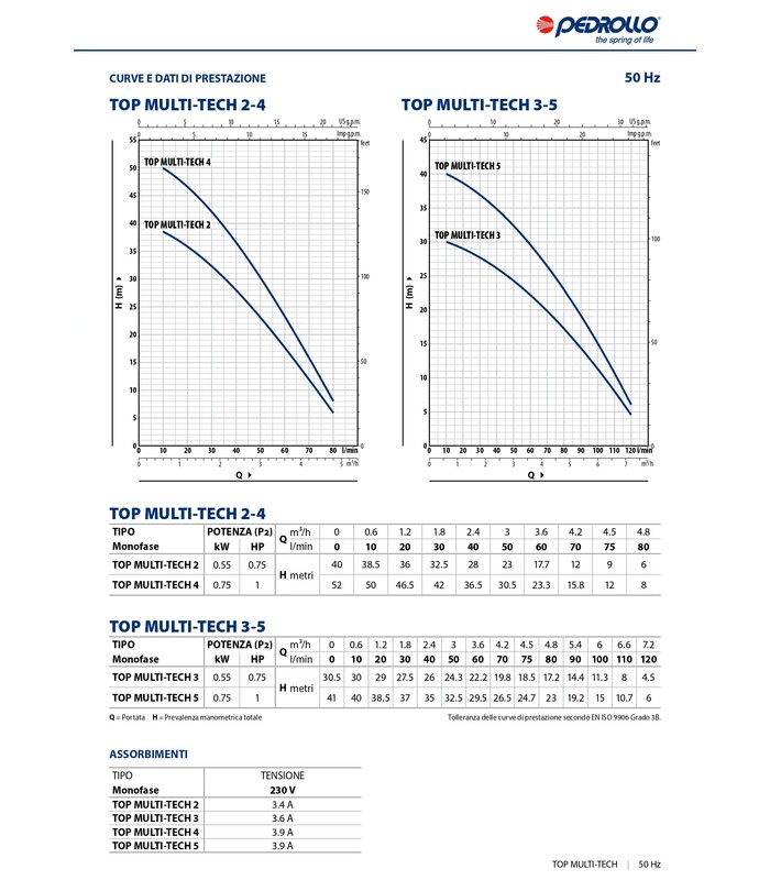 Le TOP MULTI-TECH sono provviste di un dispositivo elettronico interno che avvia l'elettropompa a seguito del calo di pressione dell'impianto (ad esempio all'apertura di un rubinetto) al di sotto di 1.5 bar e la arresta quando il flusso scende sotto i 3 litri al minuto.