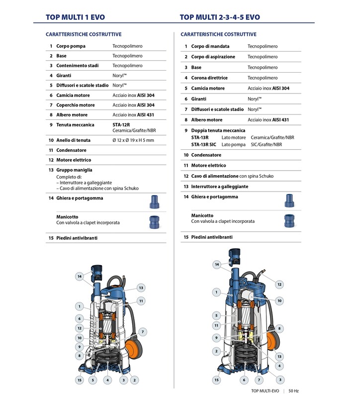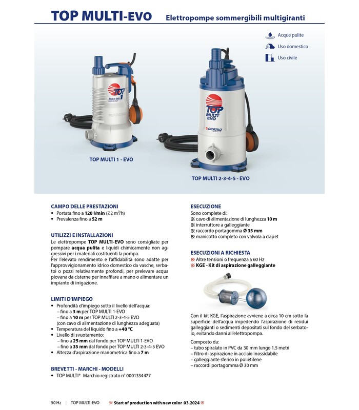 Le elettropompe TOP MULTI-EVO sono consigliate per pompare acqua pulita e liquidi chimicamente non aggressivi per i materiali costituenti la pompa. Per l'elevato rendimento e l'affidabilità sono adatte per l'approvvigionamento idrico domestico da vasche, serbatoi o pozzi relativamente profondi, per prelevare acqua piovana da cisterne per innaffiare a mano o alimentare un impianto di irrigazione.