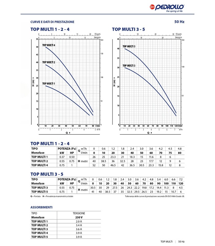 Le elettropompe TOP MULTI sono consigliate per pompare acqua pulita e liquidi chimicamente non aggressivi per i materiali costituenti la pompa. Per l'elevato rendimento e l'affidabilità sono adatte per l'approvvigionamento idrico domestico da vasche, serbatoi o pozzi relativamente profondi, per prelevare acqua piovana da cisterne per innaffiare a mano o alimentare un impianto di irrigazione.