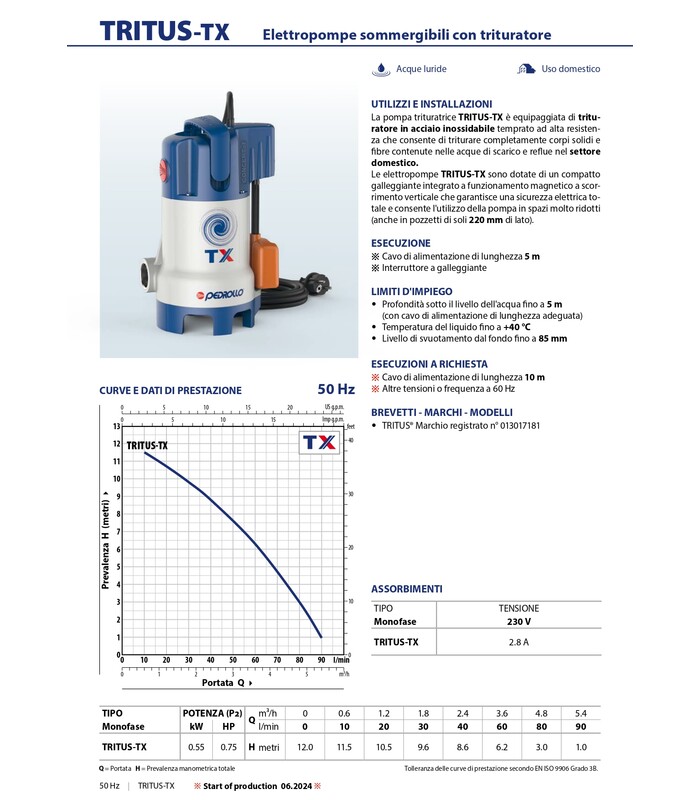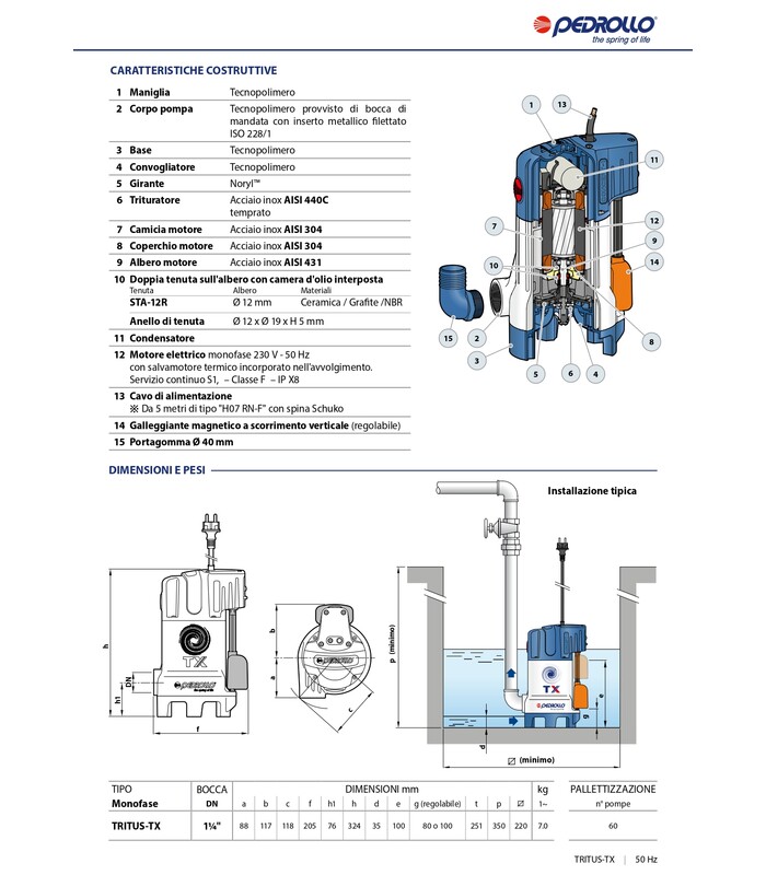 Le elettropompe TRITUS-TX sono dotate di un compattogalleggiante integrato a funzionamento magnetico a scorrimento verticale che garantisce una sicurezza elettrica totale e consente l'utilizzo della pompa in spazi molto ridotti (anche in pozzetti di soli 220 mm di lato).