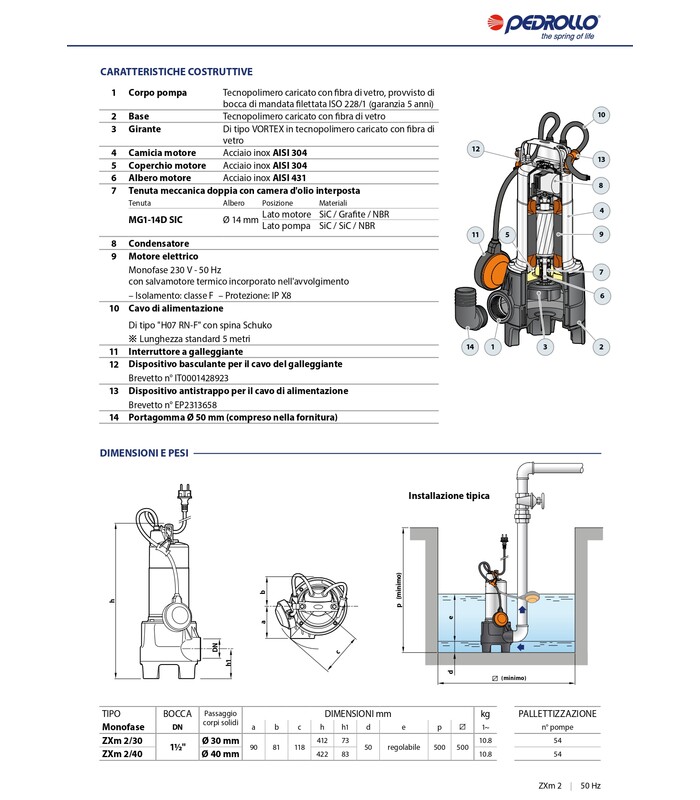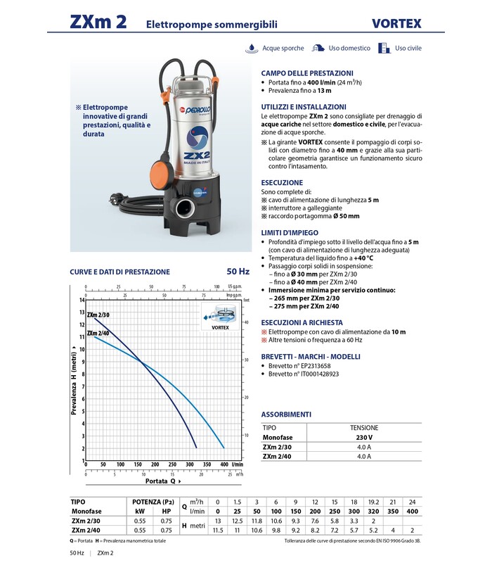 Elettropompa Sommergibile ZXm2 220V Monofase per Acque Sporche ''Vortex''