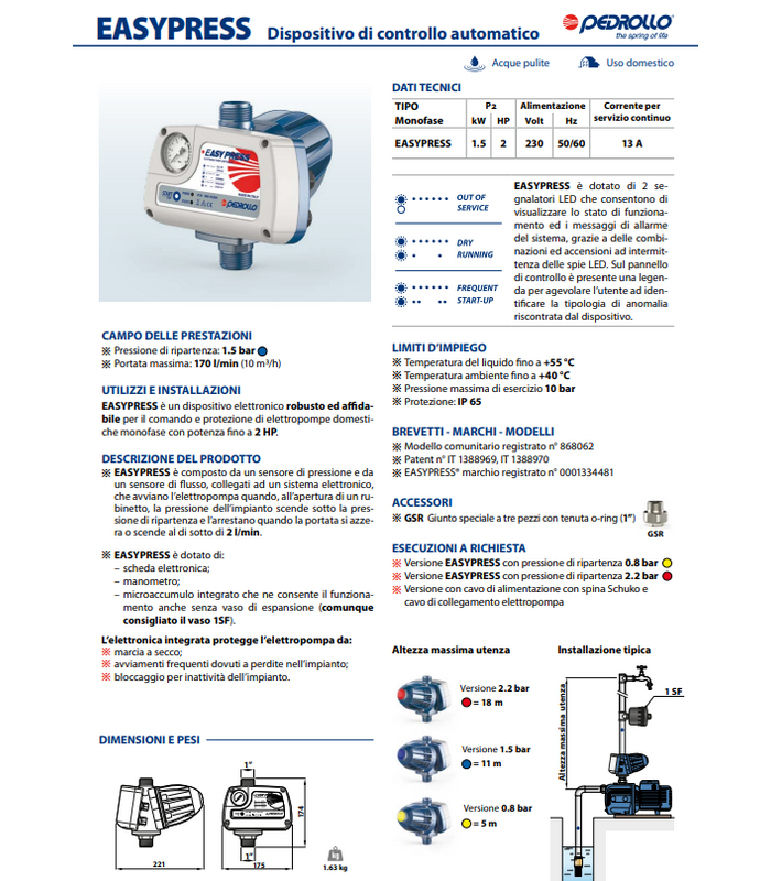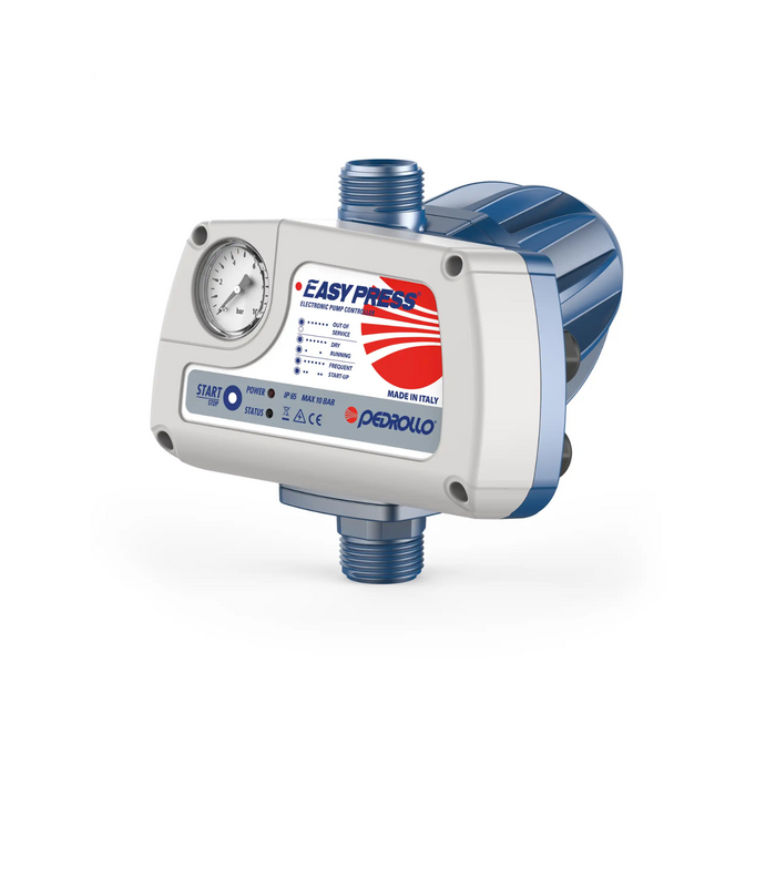 EASYPRESS è composto da un sensore di pressione e da un sensore di flusso, collegati ad un sistema elettronico, che avviano l’elettropompa quando, all’apertura di un rubinetto, la pressione dell’impianto scende sotto la pressione di ripartenza e l’arrestano quando la portata si azzera o scende al di sotto di 2 l/min. L’elettronica integrata protegge l’elettropompa da: marcia a secco; avviamenti frequenti dovuti a perdite nell’impianto;bloccaggio per inattività dell’impianto.