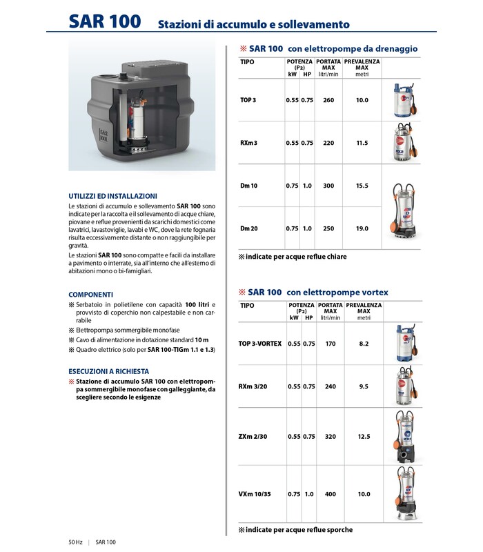 Le stazioni di accumulo e sollevamento SAR 100 sono indicate per la raccolta e il sollevamento di acque chiare, piovane e cariche provenienti da scarichi domestici come lavatrici, lavastoviglie, lavabi e WC, dove la rete fognaria risulta eccessivamente distante o non raggiungibile per gravità.