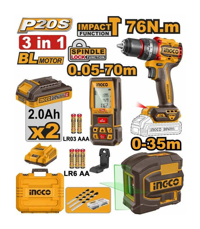 SET TRAPANO AVVITATORE 76NM + LIVELLA AUTOLIVELLANTE VERDE + RILEVATORE DI DISTANZA INGCO