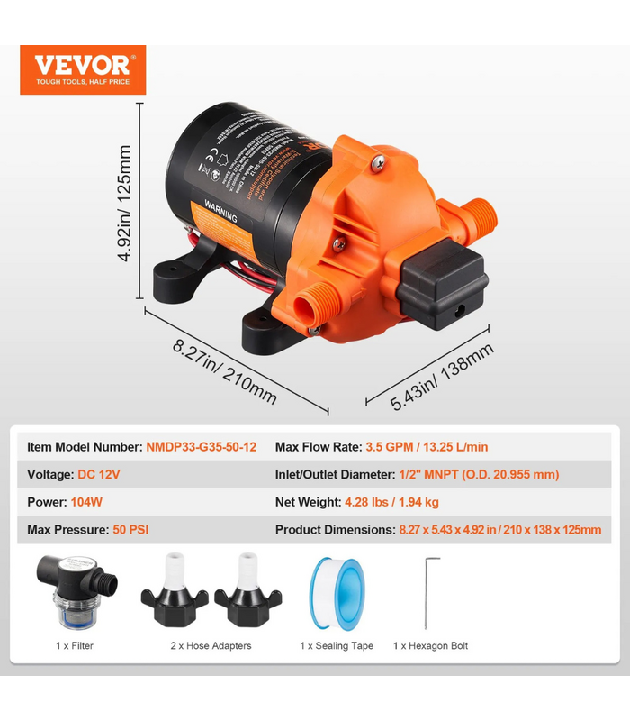 Pompa ad alta portata da 4 GPM: la nostra pompa a membrana da 12 V ad alte prestazioni eroga una portata massima di 4 GPM (15,1 L/min), una pressione massima di 40 PSI e un'altezza di autoadescamento di 3 metri