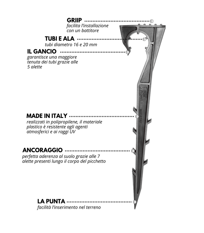 Picchetto Reggi tubo realizzato in plastica e adatto per tubi di diametro 16 mm o 20 mm.