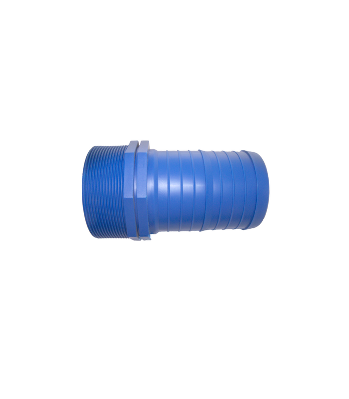 Il raccordo Portagomma per Layflat Filettato Maschio ha un'estremità a portagomma per l'inserimento nel tubo layflat e un'altra estremità con filettatura maschio per il collegamento a valvole o altri raccordi filettati.