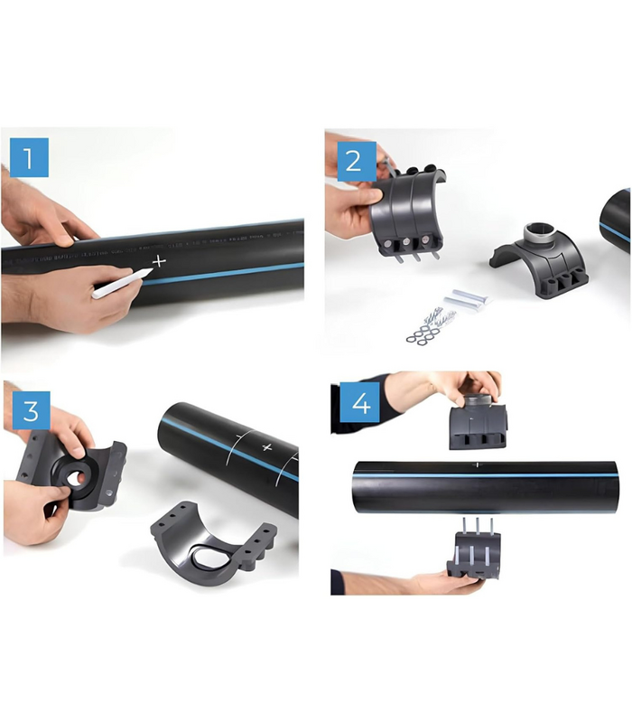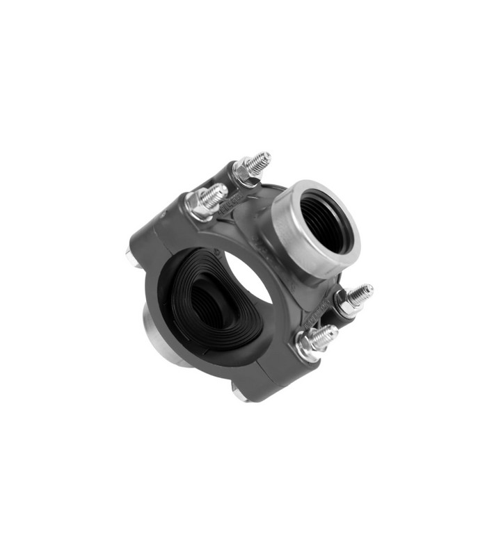 Una presa a staffa con due fori è un raccordo utilizzato principalmente per creare una derivazione dalla tubazione principale senza la necessità di tagliarla.