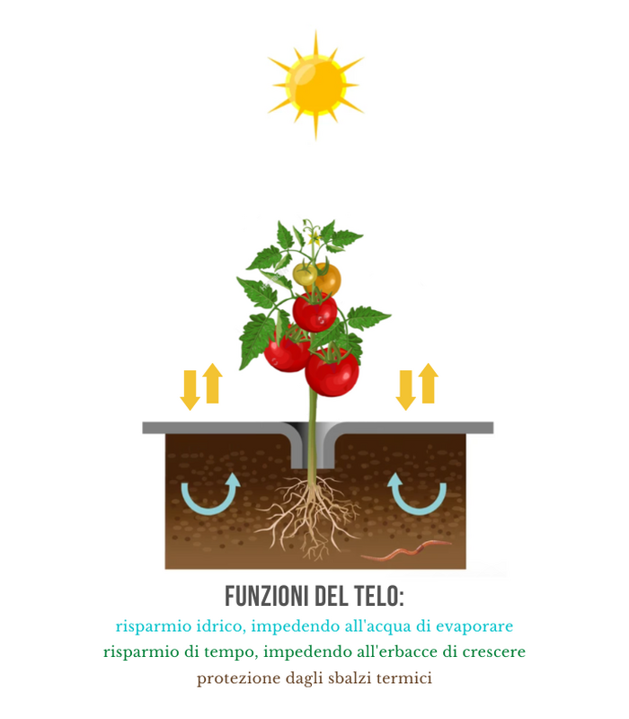 - Favorisce la vita nel terreno: La pacciamatura offre uno strato protettivo che riduce gli sbalzi di temperatura e l'umidità. Favorisce lo sviluppo di microrganismi sulla superficie e consente il rilascio di nutrienti necessari per lo sviluppo degli ortaggi (mineralizzazione).