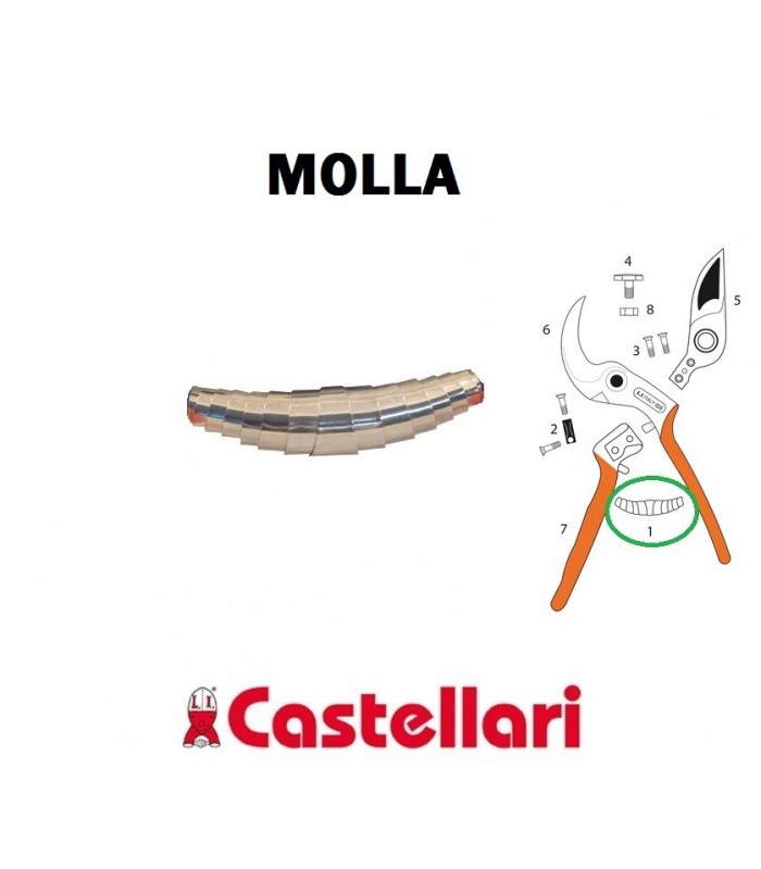 La molla Castellari è un componente di ricambio originale per le forbici da potatura Castellari, realizzata in lamiera d'acciaio a spirale, progettata per garantire il corretto movimento di apertura e chiusura delle lame; è un elemento elastico fondamentale per il funzionamento meccanico dell'attrezzo, che permette il ritorno alla posizione iniziale dopo la pressione.